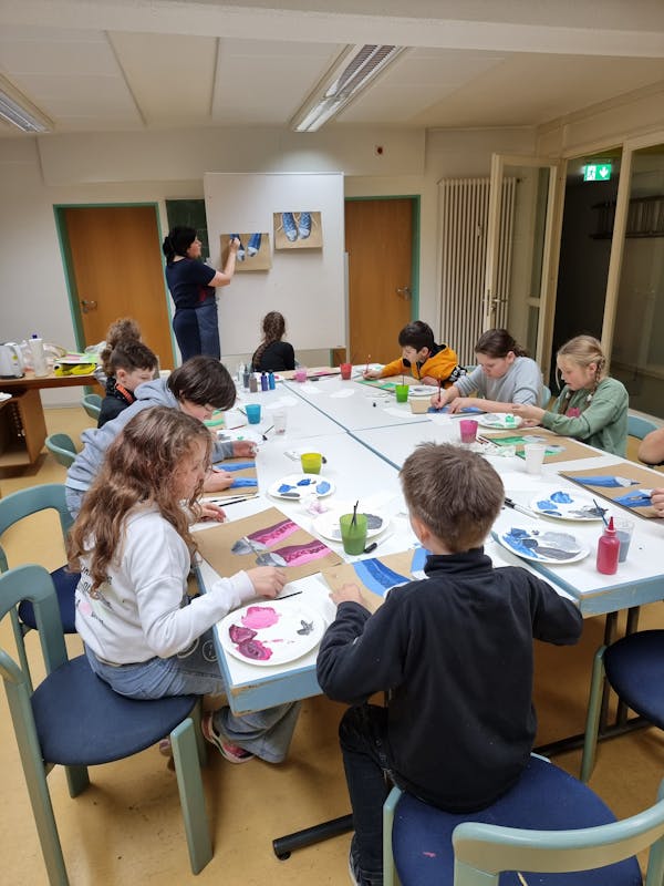 Die Kinder lernen, wie man Theaterkulissen zeichnet und Puppen selbst herstellt.